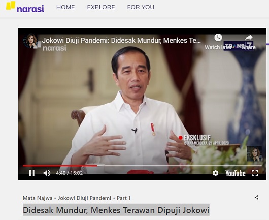 Foto tersebut berasal dari video program Mata Najwa yang dipandu Najwa Shihab pada sesi wawancara dengan Jokowi di Istana Merdeka, Selasa 21 April 2020. Video itu dimuat pada situs narasi.tvdan pada kanal Youtube Najwa Shihab pada Rabu, 22 April 2020.